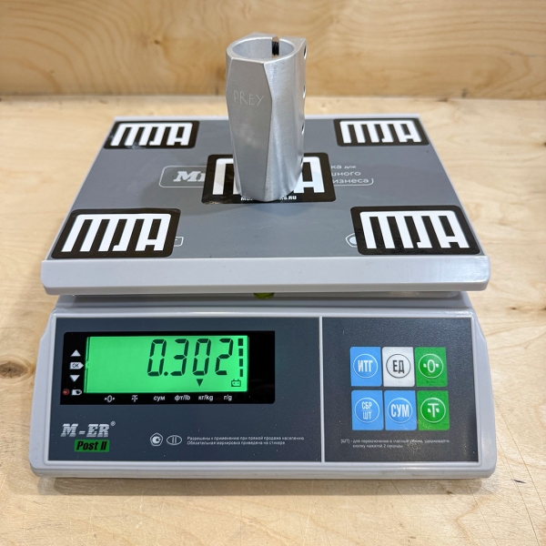 Высокий (90мм), из 6061 алюминия и с увеличенными кастомными болтами М8 (и с гробом). Болты, кстати, сделаны так, чтобы держать всей резьбой и, при этом, не торчать из зажима - кайф, в общем. 30мм блинчик с болтом м6 в комплекте.