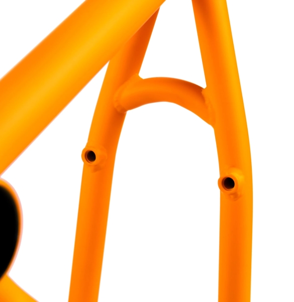 Место крепления верхней и нижней труб к рулевому стакану усилено косынками. Это простое и надежное решение для увеличения прочности. Перья заведены на верхнюю трубу, так что градусов можно не бояться.